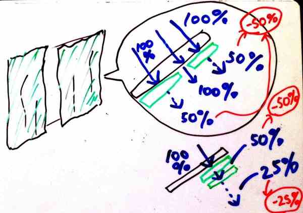 その考え方は、もちろん間違っています。カーテンや布が光を50%減らすことができるとしたら「何かに覆われていない部分を布やカーテンで覆えば、光を100%から50%まで減らすことができる」(つまり窓から差し込む光の半分を減らすことができる)のに対して「すでにカーテンで遮られている部分を、さらに布で覆ったとしても、(すでに100%の半分にまで減っている)50%の光を25%にする」ことしかできません。窓から差し込もうとする光の4分の1しか減らすことができないわけです。カーテンを重ねるのは非効率なのです。