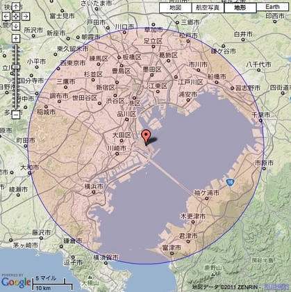 下の2つの図は、東京湾に浮かぶ羽田空港から半径30kmの円を描いてみたものです。「○×△から30kmの地域」というのは、こんな広さです。自分が暮らす狭いエリアに半径30kmの円を刻んでみれば、それは驚くほど広い面積です。…半径30kmというのは、そんな広さです。