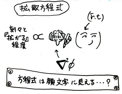 たとえば、「何かが(時間的に)刻々と広がってく量は、その何かの空間的な傾きで決まる」という拡散方程式を、物理量をφ(r,t)と記し・さらにナブラ演算子を使って記述した拡散方程式などを見ると、私には「左利きの人が筆記用具を手にして、耳をかきながら、うつむき気味に何かを考えている」「その横には横を見ながら、口を尖らせている」ようすに見えてしまうのです。そんな「顔文字で記した拡散方程式」が下の板書です。