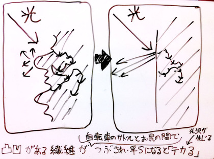 ところが、毎日自転車のペダルを漕いでいる女子高生たちの制服は、サドルとお尻で擂(す)り潰(つぶ)されて、繊維表面が真っ平らに変形していきます。表面が凸凹とした繊維からの反射光は強くありませんが(テカりませんが)、表面が平らに潰された繊維からの反射光は強く・そんな制服を育てた「女子高生のお尻」はテカり輝いてしまうのです。