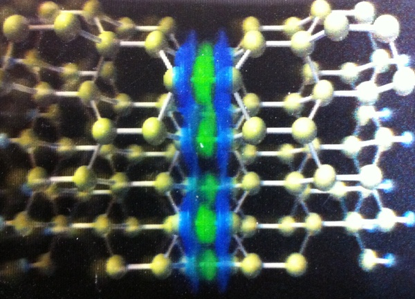 「そんな答えが合っているかどうか」を確かめたくて、念のため、手元にあった「レンチキュラー・シートを使った”分子構造”の立体画像」に(家にある材料の中では屈折率がプラスチックに近い液体である)サラダ・オイルを振りかけて、顕微鏡で真上から撮影したのがこの写真です。プラスチック・レンズにサラダオイルを振りかければ、当たり前の話ですが、レンズ効果はどこか遠くに消え失せて、レンズの無効にどんな画像が描かれているのかを自然に眺めることができるようです。