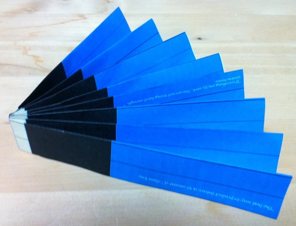 このPDF(sense.pdf 282kB)をカラープリンタで両面印刷して(両面印刷ができなければ、手差し給紙で両面プリントをして)、写真のように折りめば(必要であれば余白部分を切り取った上で、そして中央部分をテープか糊で貼り付ければ)、ハイ!「ハンディタイプのペーパー扇子」のできあがり!!です。