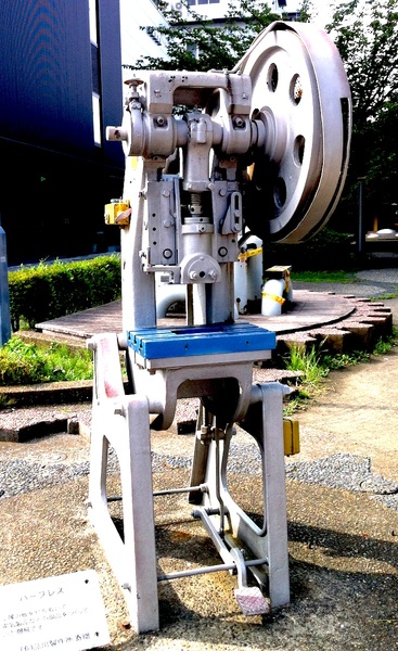 今日眺めた「理系の散歩道」は新横浜駅近くにある「新田緑道」です。暑い日差しを心地良く緑(みどり)が遮(さえぎ)る小道には、懐かしくも力強い機械や部品が詰まっていました。足下にギアやチェーン形状が埋め込まれているかと思えば(右写真に見える”ギア”は道路に埋め込まれた”ギア”なのです)、ふと座り込んだベンチもチェーンの形をしていたりします。そして、道の端を彩るのはプーリーやネジで、ところどころにボール盤やバープレスなどが置かれていたのです。