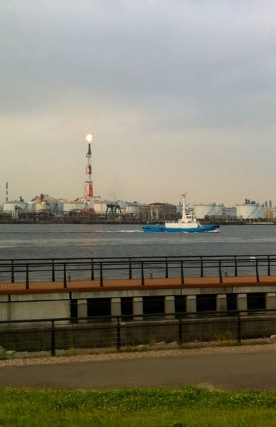 東扇島は羽田空港の向かいに位置するので、飛行機の離着陸を近くに見ることができ、東京湾の波間の上を行き交う巨大船を間近に眺めることもできます。休日の昼間にはバーベキューをしている人たちもいますが、平日の昼〜夕方には人影はほとんどありません。海の向こうに見えるビルや工場群を見ながらキスを交わし合う恋人たちもいたりしますが、それでも、数百メートル四方には「人の密度は十人/km^2」ほどしかいないような気がします。