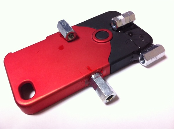 まずは、DIYショップやホームセンターに行き、一個50円の内径1/4インチのナットを買います。内径1/4インチのナットは、カメラに備えられている三脚固定用のネジ穴と同じものです。そして、(スマートフォンを持っている人なら、きっと持っているだろう)スマートフォン用ケースに、その1/4インチ・ナットを超強力接着剤でガチッと固定してしまうのです。横位置・縦位置、カメラを固定したい方向・向きに合うように、ナットをスマートフォン用ケースに固定してしまえば「三脚取り付け対応スマートフォン用ケース」のできあがり、です。