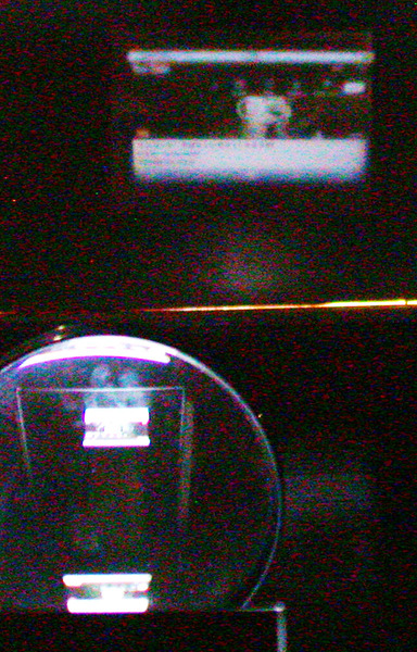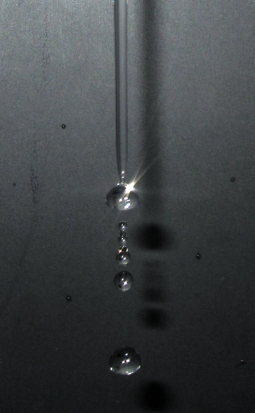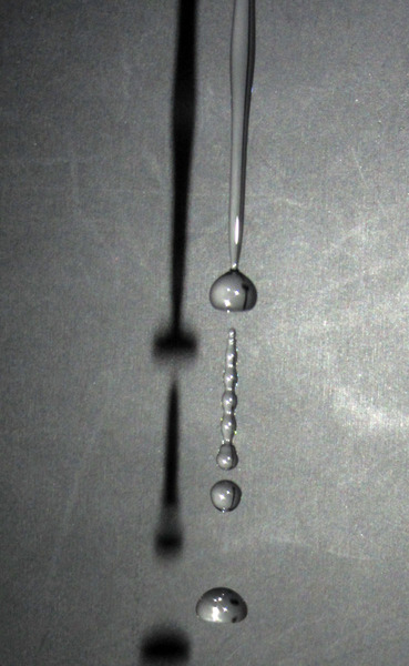 空気中にただよう水滴は、基本的に重力で下に落ちようとしているわけですから、水滴の下面から空気抵抗を受けひしゃげた形になります。今日は、そんな空気中を落ちていく水滴の形を眺めようと、蛇口の水が水滴へと変化していくようすをコンパクトデジカメで撮影してみました。それが右の写真です。撮影シャッタースピードを10万分の1秒に強制設定し(CHDK)、水滴に向かって「はい、チーズ!」とやってみた記念写真です。ひしゃげた形の水滴が、ガラス細工か水飴(みずあめ)であるかのように柔らかく映っています。