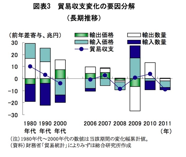 2011年の貿易収支が赤字に転じたのは、原油などの輸入価格上昇が主因。資源価格の動向が当面の貿易収支を左右。