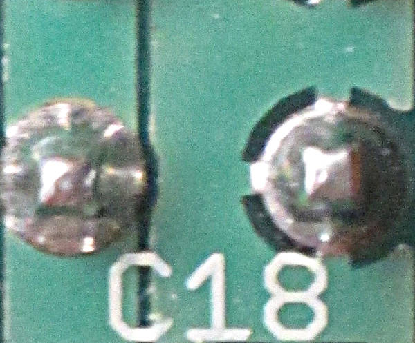 右に貼り付けた回路基板の拡大図、(C18とマーキングされた上の)右と左の接点を眺めてみると、右の接点だけが、まるで出島のように、行き来(往来)を閉ざす構造になっています。