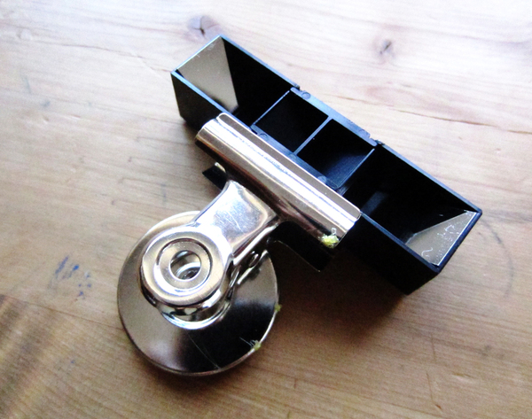 デイリーポータルZに書かれている説明には、「3Dアダプタを両面テープでスマートフォンに貼り付けよ」とあります。しかし、そうしてしまうと(他の用途に使えなくなってしまいそうで)少し不便に思われます。・・・そこで、iPhone用ケースに金属板を接着剤で貼り付け、100 円ショップで「磁石付き目玉クリップ」を買い、3Dアダプタをクリップで挟んで、iPhone用ケースに磁力で貼り付けることにしました。そんな「取り外し可能な3D自由自在」の完成品が、右上の写真です。