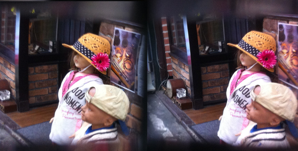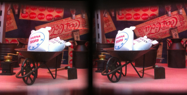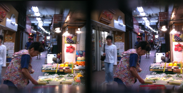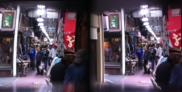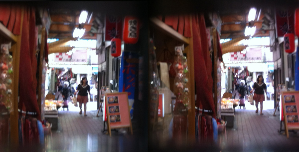 下の写真は、デイリーポータルZ・プレゼンツの(富士通研究所製)3D写真アダプタをiPhone4に取り付け撮影した、横浜六角橋商店街の写真です。