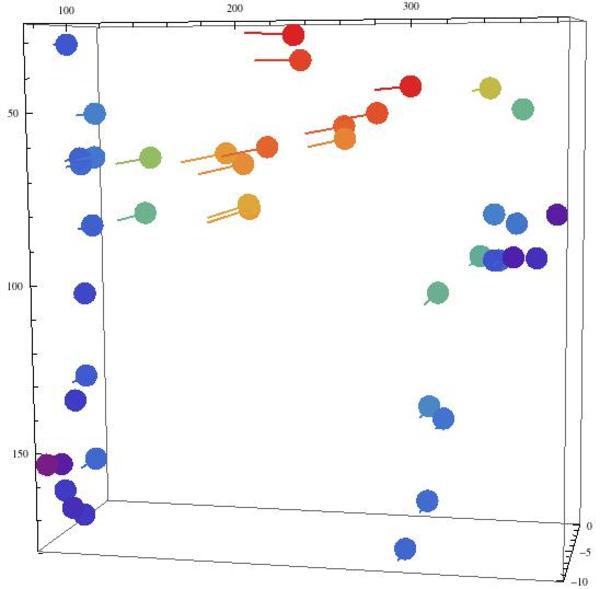 さらに、左右視差画像中の特徴点座標から、距離(立体)推定を行ってみたのが下に貼り付けた散布点グラフです。縦と横は画像の縦と横に対応し、色と(奥行き方向)が「推定された距離」を示しています。