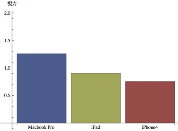 アップルが「Retina画面」と呼ぶMacbook Pro Retina・New iPad・iPhone4の画面の画素サイズを「このくらいの視力の人なら識別することができる」という「視力換算」したものが右のグラフです。
