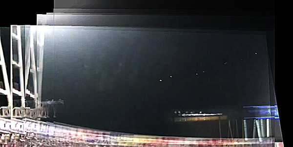 『パノラマ画像で眺める「巨人阿倍の空中バウンド・ホームラン」の秘密!?』で書いた”カメラワーク”の影響を除去した上で・ホームランボールの軌跡を映し出す」スクリプトを書き直してみました。たとえば、下に貼り付けた画像は、巨人阿部選手のホームランボールが外野上空を飛翔していく0.5秒ほどの動きを、一枚の画像として合成したものです。…そうして眺めてみると、見事なくらいの「綺麗で美しく自然極まりない放物線」を巨人阿部が打ったホームラン・ボールは描いていることがわかります。