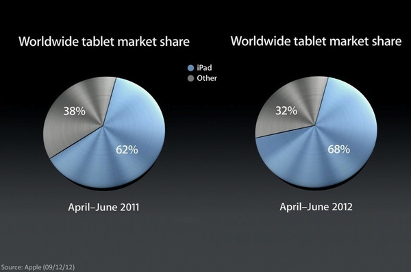 Appleが9月12日に示した「タブレット市場におけるiPadのシェア推移」のグラフ(参考:CHART OF THE DAY: Tim Cook Used These Charts To Make Fun Of Amazon And Google's Tablet Sales)が何だか少し奇妙です(右図)。何がどのように奇妙かというと、円グラフに描かれている「データ系列」が12時の位置からではない、ということが奇妙なのです。
