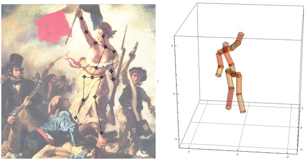 ドラクロワの「民衆を導く自由(La Liberté guidant le peuple)」に描かれている民衆を導く女性を相手に、人体姿勢推定をしてみました(結果の空間は座標軸が反転してしまっているようですね)。民衆を導く「自由(女神)」の骨格を眺めてみると、力強い上半身とは裏腹に、下半身の方は内股だったりするのが意外です。