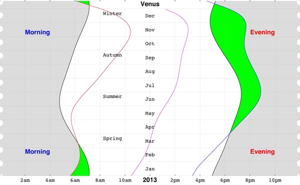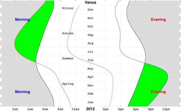 昨年、2012年は、前半が「金星が宵の明星として見える時期」で、後半は「金星が明けの明星として見える時期」でした。 下の図は、2012年の「日の出・日の入りの時間」と金星が見える時間帯(緑色で塗りつぶした部分)を描いたものです。 前半(下半分)は夕暮れを過ぎた頃が緑色になっていて、つまり金星=宵の明星が見える状態で、後半(上半分)は日の出前の時間帯が緑色(金星=明けの明星)が見えることがわかると思います。春が終わり・夏が始まる頃、宵の明星は姿を消して、明けの明星が見えるようになったのです。