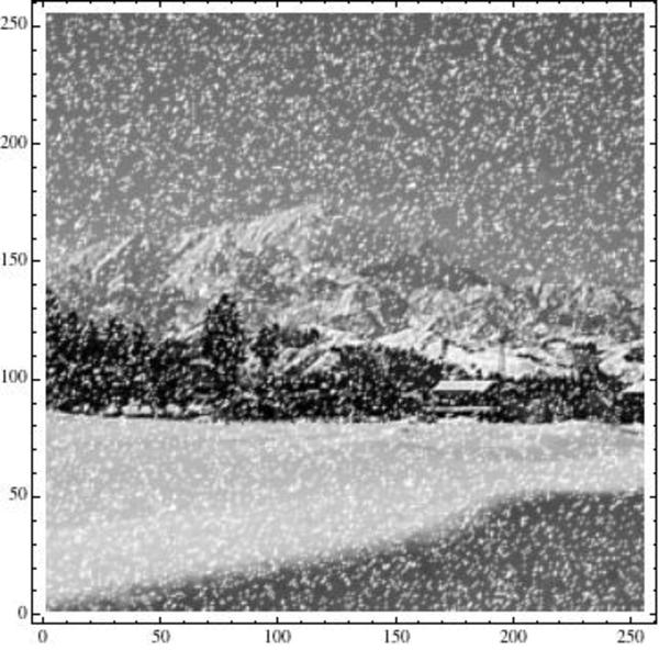 たとえば、冬景色に対して、ほぼ無風下でほんの少しの雪が降っていたとします(下左写真)。雪粒子の量が10倍に増えた場合の視界を、光の演算や視覚がすべて線形な重ね合わせができるという条件下でシミュレーション計算してみると、下右写真のようになります。確かに視界が悪くなっています。
