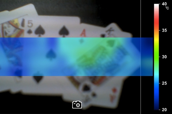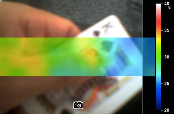 まずは(適当に切った)トランプからカードを1枚抜いて手に持ってみます。カードを手に持ったさまを、試しにサーモカメラで撮影してみたのが、右に貼り付けた画像です。