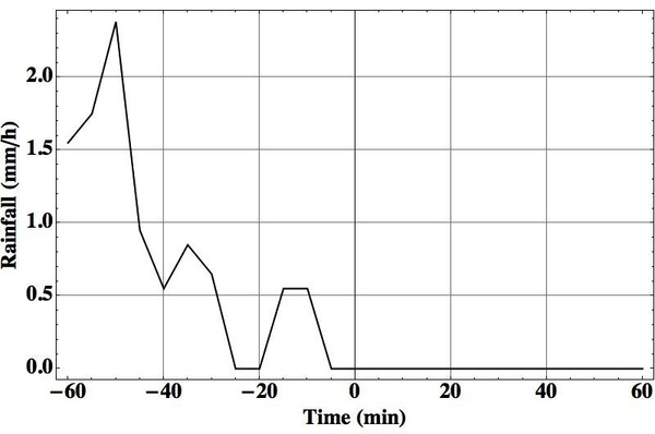 data = Import[ "http://weather.olp.yahooapis.jp/v1/place?coordinates=hoge, "XML"]そのXMLをパースすると、たとえば下のような(横軸が時間=分、縦軸が降雨量を示した)降雨量推移・予測グラフを描くことができます。5〜10分刻みの(過去の)降雨量推移や、あるいは未来の予報を知ることができるなら、日々刻々の私たちの判断も、それに応じて(ほんの少しだけ)最適化されていくかもしれないですね。