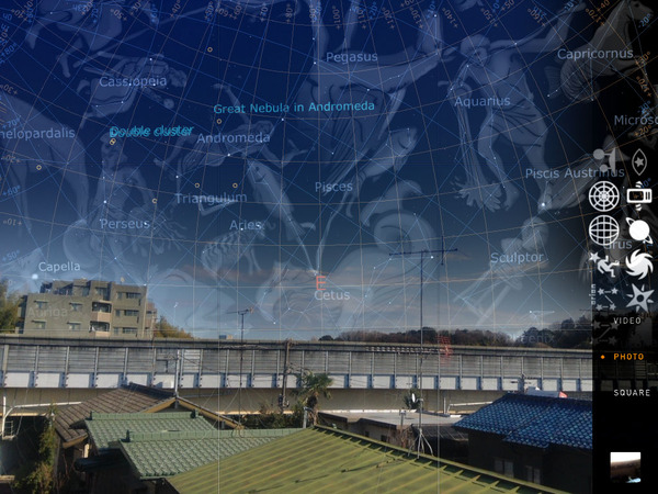 昼間、目にすることはできないけれど、空には星が浮かんでいます。そんな私たちの頭上に拡がっている昼の星空を映し出すことができる「幻想カメラ」が欲しくなり、iPadでプラネタリウムソフト Sterallium で眺めた画像と標準カメラで撮影した画像を合成して、それ風の「撮影画像」を作ってみました。