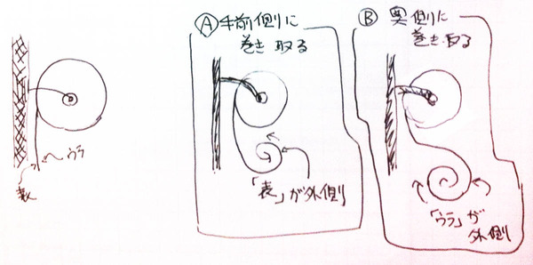 上図のような、トイレットペーパーが「壁に離れた側から紙が足らされている状況」というのは、実は日本でよくある風景です。「日本では実はよくある」ということを逆に言うならば、それは、他の国では特に自然とは限らない点ということです。他国のトイレットペーパーでは、たとえば下図のように「壁に近い側に紙が足らされている状況」であることも多く、そんな場合には、トイレットペーパーに手を伸ばし自然に紙を丸めても(それと逆向きは、実際のところ、かなり不自然な向きになります)、柔らかな「表(おもて)面」が外側を向くのです。