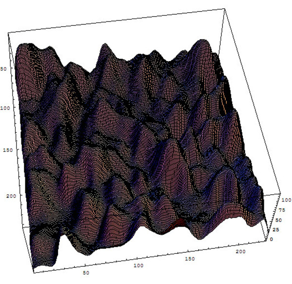 赤い血が流れているはずの血管が青く見える理由で行った計算を大雑把に解けば、たとえば完全拡散体として扱うことができます。それはすなわち、任意の微小領域が周囲に発する光強度は周囲(の微小部分が発する光強度)の平均値になるということで、つまりはラプラス方程式で表される解になります。