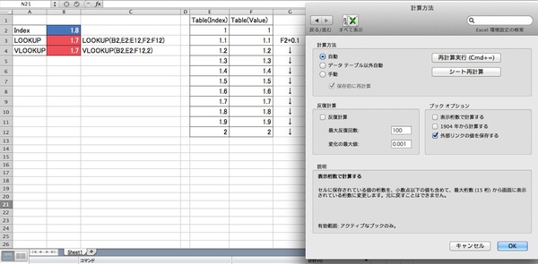 Microsoft Excelでルックアップテーブル(入力値と出力値の対応表を使い、入力値から出力値を返す機能)を使いハマった方がいました。その状態を再現してみたのが、下に貼り付けた画面です。(画面右にある)「入力値Table(Index)と出力値Table(Value)を対応付ける対応表」を使い、LOOKUP関数およびVLOOKUP関数により、画面左上部にある入力値(Index)から値出力をさせてみたところです。見るとわかるように、入力値(Index)には1.8とタイプされていて、(対応表は入力・出力の組み合わせとして同じ値が入っているので)返ってくるのも1.8かと思いきや、出力されているのは1.7という結果です。・・・一体なぜなのでしょうか? エクセルの「バグ」なのでしょうか?