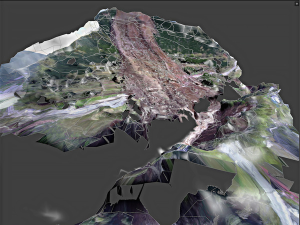 また、自分で3次元形状を生成してやれば、さらに下に貼り付けたような(国土地理院が提供している3Dマップより)高解像度な形状を得ることもできる。そのようにして得られた3次元の世界を、たとえばヘッドマウントディスプレイ(HMD)で立体視したりすれば、土砂の流れもわかりやすく感じられる。