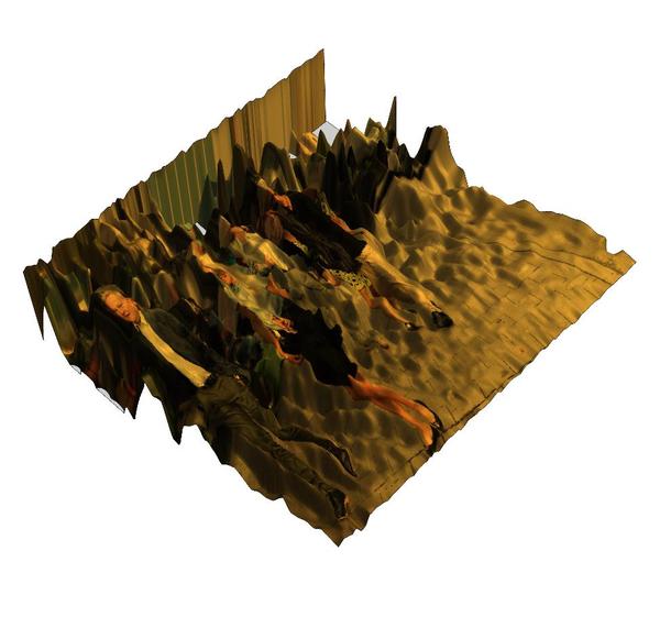 そしてまた、推定した距離画像に、RGB色画像をテクスチャマッピングして3次元的に眺めてみた例が右の画像です。近景を歩く数人と、その後ろに広がる遠景が形作る箱庭のような風景をこんな風に3次元グラフとして眺めてみるのも面白いような気がします。