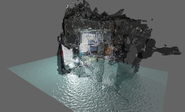 …というわけで、取り込んだ実世界を海面の上に浮かべてみました。たとえば海水面が上昇し、「作業机」が海辺になったなら?的世界を作り出してみた…というわけです。実世界のさまざまなデータをTheta Sで手に入れたなら、「実世界を自由自在に加工できたりする」のが面白いところです。