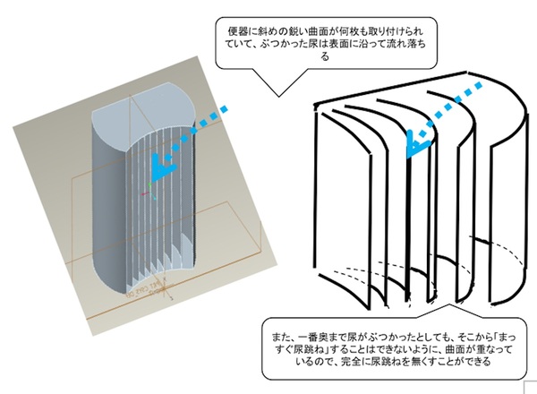 それでも「尿跳ねを防ぐ究極の小便器」を作りたい!というプロジェクトがあります。UrineLuckと名付けられたこのプロジェクトは、「尿が便器に向かって斜めにぶつかってきた場合には尿跳ねはしない」ということを利用したものです。 便器面に鋭い板をたくさん取り付けて、飛んできた尿がそれらの板に沿って流れていくように設計されているのです。また、さらに、便器の奥面に向かって尿が勢いよくぶつかったとしても、尿が跳ね返ってくることができない板を斜めに曲げつつ配置させることで、尿跳ねを全く生じさせない究極の小便器を実現するというのです。この小便器が搭乗したら、まさに理想の小便器になりそうです。