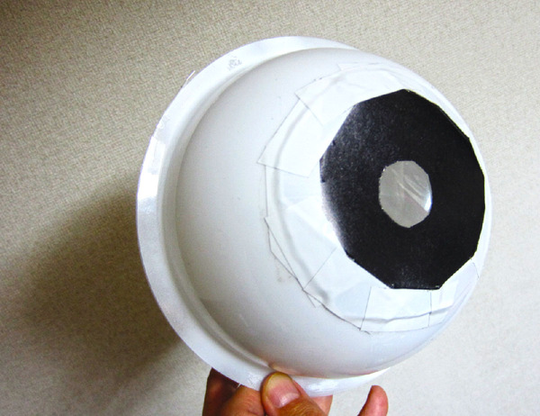 そこで、以前作った全球ディスプレイを作るためのパーツを利用して、「眼球の型をしたピンホールカメラ」模型を作ってみました。直径30cmほどの白球体に、瞳形状の絞りを貼り付けて、さらに瞳中心にはレンズを固定して…網膜に映る映像を(眼球の後ろ側から)の眺めることができる模型を作ってみました。