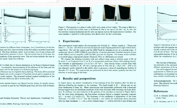 場所や状況に応じた飲み物を、その時の気分だけではなくて、その場所の「振動や揺れ」に応じて選びたい!と考える人に役立つこの論文は、飲み物の上面に浮かぶ「泡(foam)」が、どのように飲み物自体の揺れ・振動を抑える効果があるかを示している。液上面に泡がわずか数ミリメートルあるだけで、液面の揺れが数分の1に治まるようにすることができる現象解析をした論文だ。