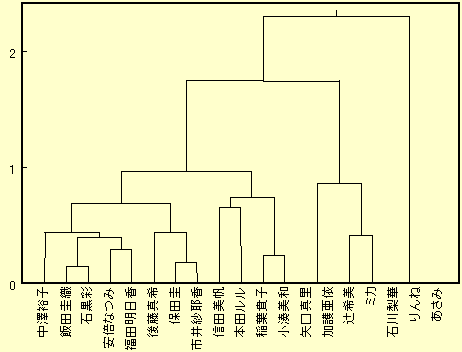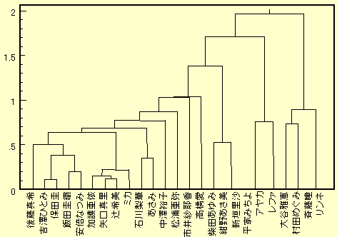というわけで、つんく率いるハロープロジェクト関連で発売されているCDの枚数(なんと80枚以上だ!)に驚きながらも、CDに参加しているメンバーのデータをソフトに流し込んで、適当な各メンバーの関連性を示す数値を計算した上で、まずは各メンバーを近いものに分けるために、クラスタ分析してみた。ここで、解析ソフトは各CDに誰が参加しているかだけを知っていて、「モーニング娘。」とか「タンポポ」とかのグループが結成されていることは知らないのであるが、とにかくハロープロジェクトの中の各メンバーの「組織図」が判るわけだ。(ちなみに、ここでは似通ったものを樹形図(似通った度合いを示すグラフ、会社で言えば組織図みたいなもの)として表示するために、「Excelアドイン工房」のクラスタ分析アドインを使っている。)