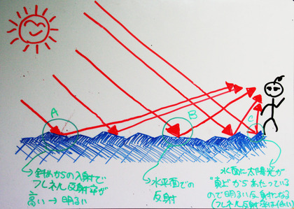 まずはじめに確実なことは、海面は平らでも滑らかでもない、ということだ。風や色々なものが原因で、海面は波立っている。海面はその場所ごとに、数限りない色々な方向を向いている。だから、「入射角と反射角が同じになるように(海面からの太陽の反射光が)進む」のだとしても、海面に写り込む太陽は、決して一点だけに見えるわけでなく、さまざまな海面上に写って見えることになる。
