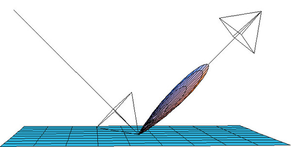 実際、表面が粗く波立った海面に太陽光が入射した時の反射光の分布を計算してみると、右の図のようになる(Modified - Blinn - Phong Model)。海面が微視的に色々な方向を向いているので、海面からの太陽光の反射は一方向のみに照射されるのでなく、色々な方向に向く。しかも、右の図は、まだ比較的表面が平らな場合の計算結果なので、実際の海面からの反射光はもっとさまざまな方向に広がる。