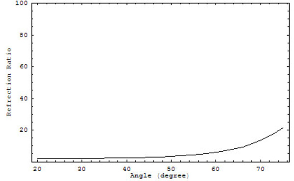 そして、重要なことは(微小領域ごとの)海面の向きにより海面からの反射光強度が等方的に分布するのではない、ということである。海面が太陽の方向を向いているときには、その(海面から見た)海面単位面積辺りに入射する太陽光強度が強くなる。そういった効果は、太陽の反射光強度を強める方向に働く。また、海面が私たちの方向に向いている(傾いている)箇所では、(微小海面から見た)水平に近い角度で太陽光が入射・反射することになる。すると、海面でのフレネル反射率が高くなり、これまた、太陽の反射光強度を強める方向に働く(右図は太陽光の入射角に対する海面での反射率を示したもの)。特にフレネル反射率は入射角度が海面に対して、水平に近くなればなるほど非常に高くなり、最後には全反射になる。そのため、「太陽光が私たちの目に反射するような角度になる微小海面」がそれほど多くなかったとしても、反射光は非常に強く見えるのである。