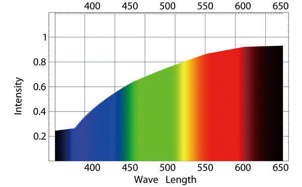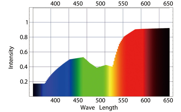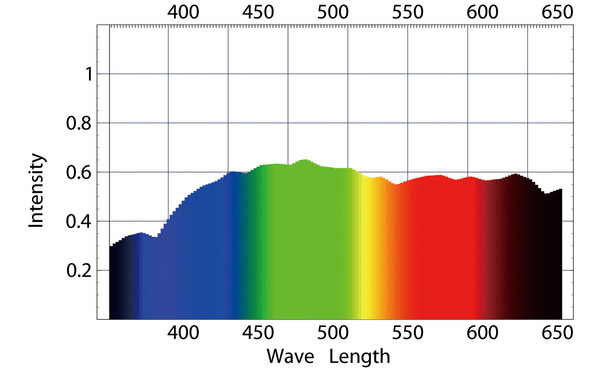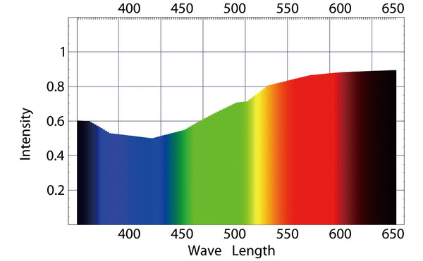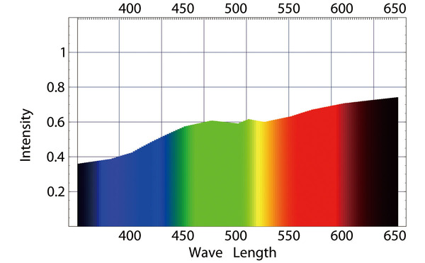 つまり、昼の日差しのスペクトルのうち、スペクトル強度が強い短波長領域では、メラニンや血液などの色吸収率が高く、その一方、「昼光」のスペクトル強度が低下する長波長域では、メラニンや血液などの色吸収率が低く、それらの結果として反射スペクトルが”結構”均等になるのだなぁ、と感じたのです。たとえば、右のスペクトルグラフが、昼光=D65光源で皮膚を照らした時の反射スペクトルの例になります(ちなみに、右下のグラフがD65光源のスペクトルです)。