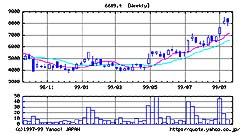 一見似ているように思える。しかし、よく見てみると軸が違っている。左のAppleComputerの株価変動は対数軸で表されている。「株価表示グラフで値の軸を対数軸にできないか」という言葉が頭にあったせいで気づいたわけだ。そこで、この違いが新鮮で「今日の必ずトクする一言」のwebmaster氏への返信に至ったわけである。