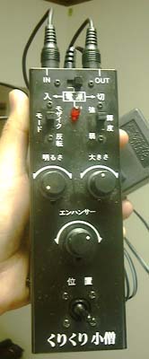 まずは、このくりくり小僧の操作方法を説明しておこう。ビデオ信号は通常のNTSC信号で入出力するようになっている。エロビデオをこの「くりくり小僧」に入力し、処理した画像をテレビへ送るのである。あるいは、処理した画像を新たにビデオにダビングするのかもしれない。