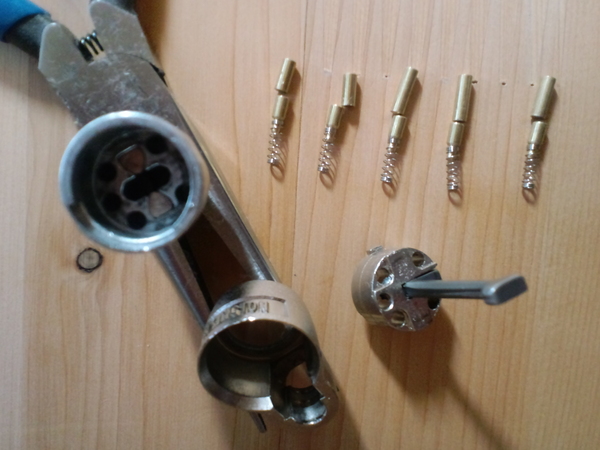 このワイヤーロックの仕組みは、シリンダーの中に5セットのバネと2本のピンが入っている。そして、その5セットのうち2本ピンのうちの片方の長さが、セットごとに違うのである。だから、そのピンの長さに応じた押し込みをすることで、シリンダーの中の回転部を回すことができるようになる、というわけだ。