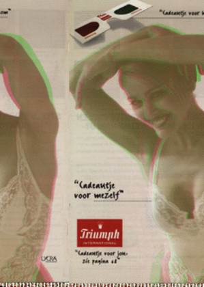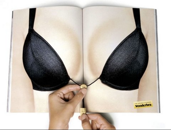 まさに「付加価値」をつけた印刷広告の、「寄せて上げる広告」 寄せて上げるワンダーブラの雑誌広告。凄いブラの広告と言えば、赤青立体メガネを使った「ブラジャーの立体広告」も面白い。トリンプとワンダーブラの立体コマーシャル対決…。