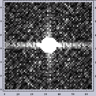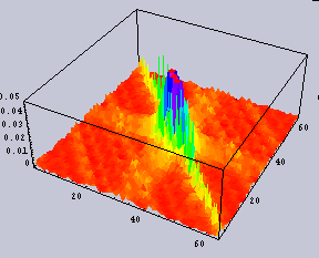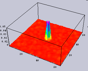 右のノイズの加わった画像の2DFTの結果では、広い周波数領域で強度が上がっている。しかし、下の鳥瞰図で示した(私は立体が好きなのだ)方でもわかると思うが、バックグラウンドが持ち上がっているだけである。いずれにせよ、あまり左右の間で違いはない。今回のような64x64の画像ではなく、もっと大きい画像ではその違いははより識別不能になる。