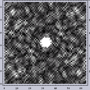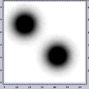 それでは、今回の本題に入る。以下が原画像である。左が「2つの大きなドットからなる」画像であり、右がそれにノイズの加わった「ノイズ」画像である。ここでノイズはホワイトノイズを加えているつもりである。ドットは周期性を持つデータだが、ノイズ自体は周期性を持たない所がミソである。また、ここで言う「ノイズ」とは現実の現象とは何ら関係がない。単なる例えである。![]() | ![]() |