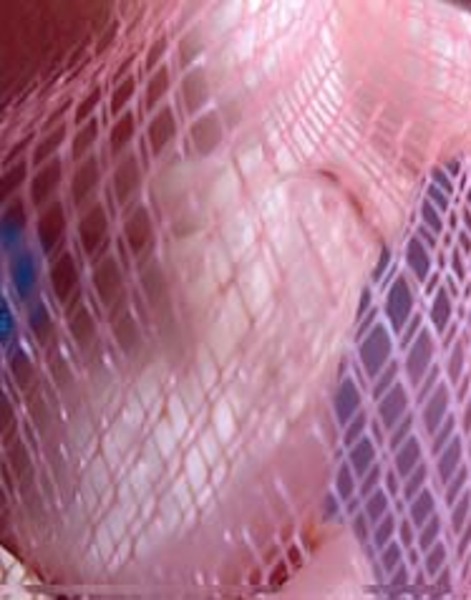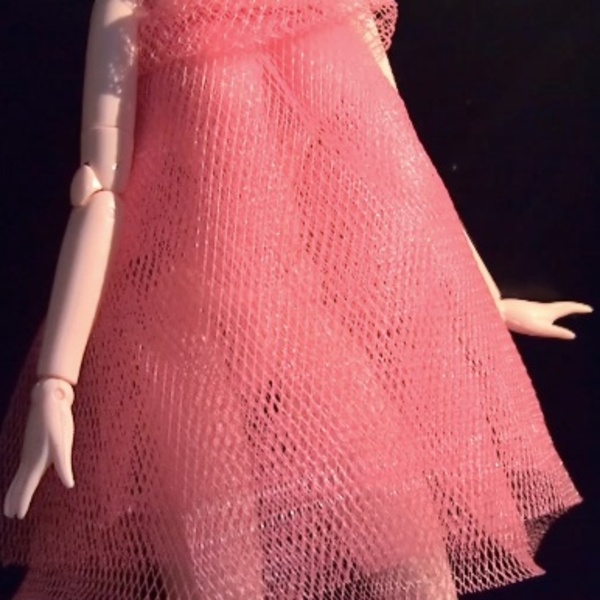 は、右の写真、身長21cmのスタイリッシュな方です。そして、「(お洒落な)目の粗い衣服」はローソン100で「三角コーナー用水切りネット」を切って作りました(右の写真は水切りネットを4枚重ねしていますが、今回の実験ではネット1枚のみで衣服を作りました)。
