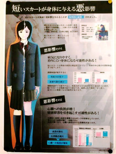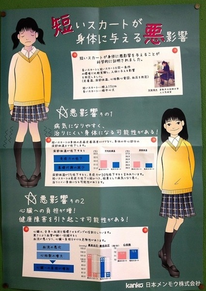 「短いスカートが体に悪影響を与えることが科学的に証明されました。」というポスターを見かけました。 「体温低下と免疫低下の相関、および、体温低下から生じるかもしれない血圧上昇からの心臓負担増加」を見積もり、短いスカートは体に悪いかもしれない…短いスカートは病気になりやすかったり・直りにくかったり、心臓負担増による健康傷害が起きるかもしれない」と謳うポスターです。