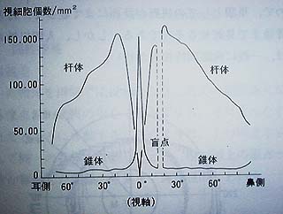 本題からははずれるが、資料を眺めていると、面白いグラフが目に入ってきた。人間の目の断面方向の視細胞個数の分布を示したものであり、錐体と桿体を個別に示してある。「盲点」なんかも図中にある。