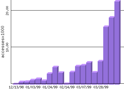 アクセス数は割に順調に伸びているようである。1999/02下旬辺りにネットワーク不調とログ解析失敗などによるデータ欠損が見られるが、それ以外ではほぼ線形に増加している。1999/4上旬に増加の傾きが変化しているのはinfoseekにページを登録したことによるものと考えられる。