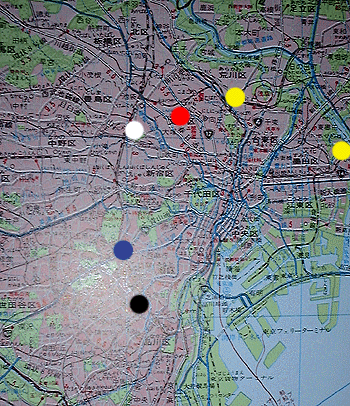 こうしてみると、五色不動の方向は江戸城を中心にして五行説の通りになっているわけではないことがわかる。しかし、江戸城を中心としているのは確かなようだ。また、黄色が二つあるのは、移転(あるいは分裂か?)があったためだという。三代将軍家光の時代に五色不動を作らせた天海大僧正の頭の中にはどのような設計図があったのだろうか?