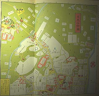 |  目黒白金図 (1858)による、目黒不動の部分。内部の位置関係はそれほど変わっていなかった。内部に入ると龍泉寺という名前が納得できるだろう。 また、「虚無への供物」が好きな方ならば、いきなりコンガラ童子達が出現するのには驚くはずだ。  1858年といってもたかだか150年前である。江戸時代の圧倒的な長さから比べたらごく最近である。  | ![]()  |